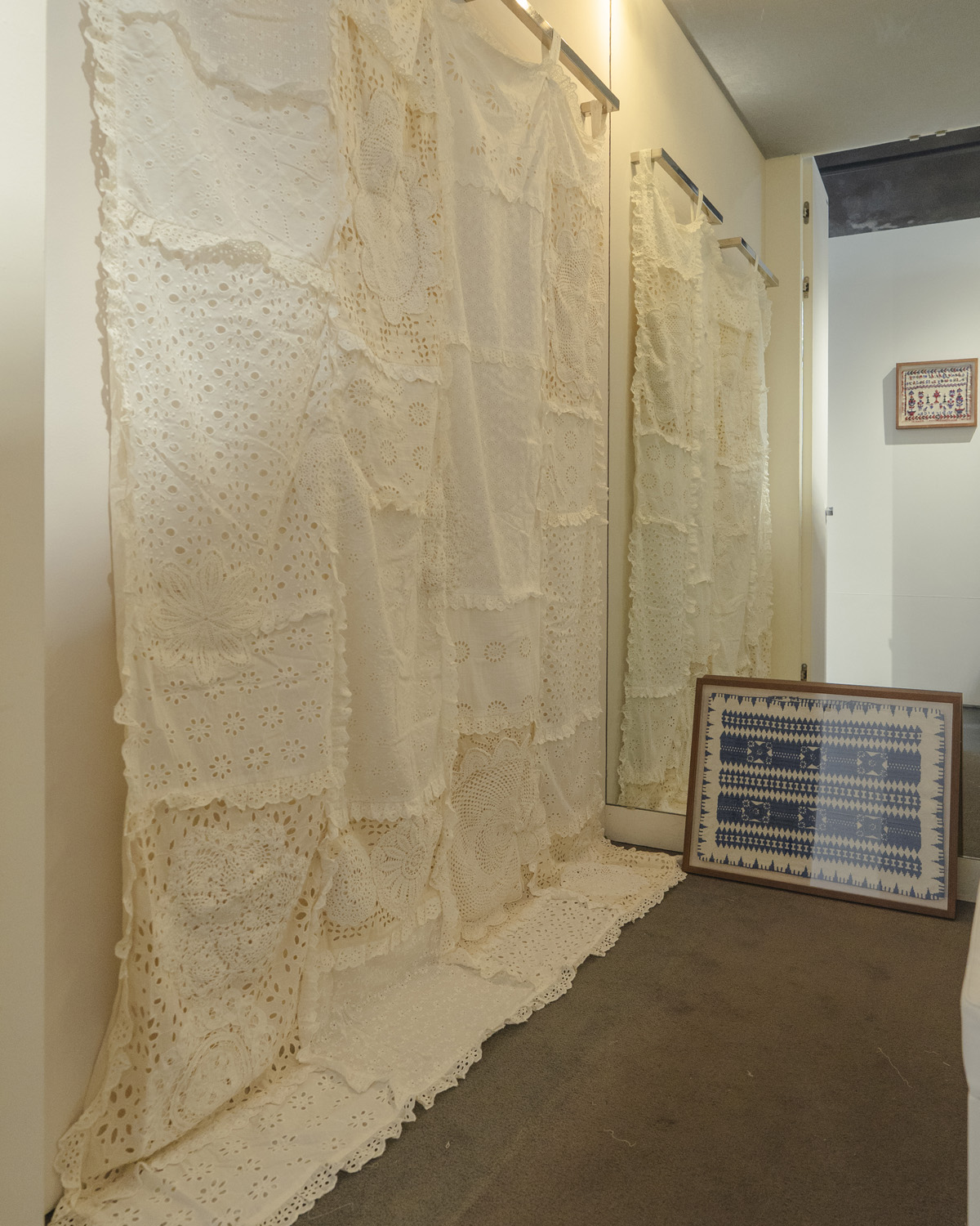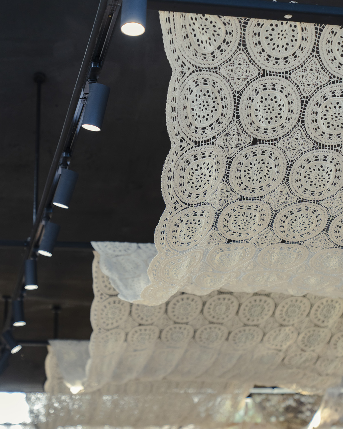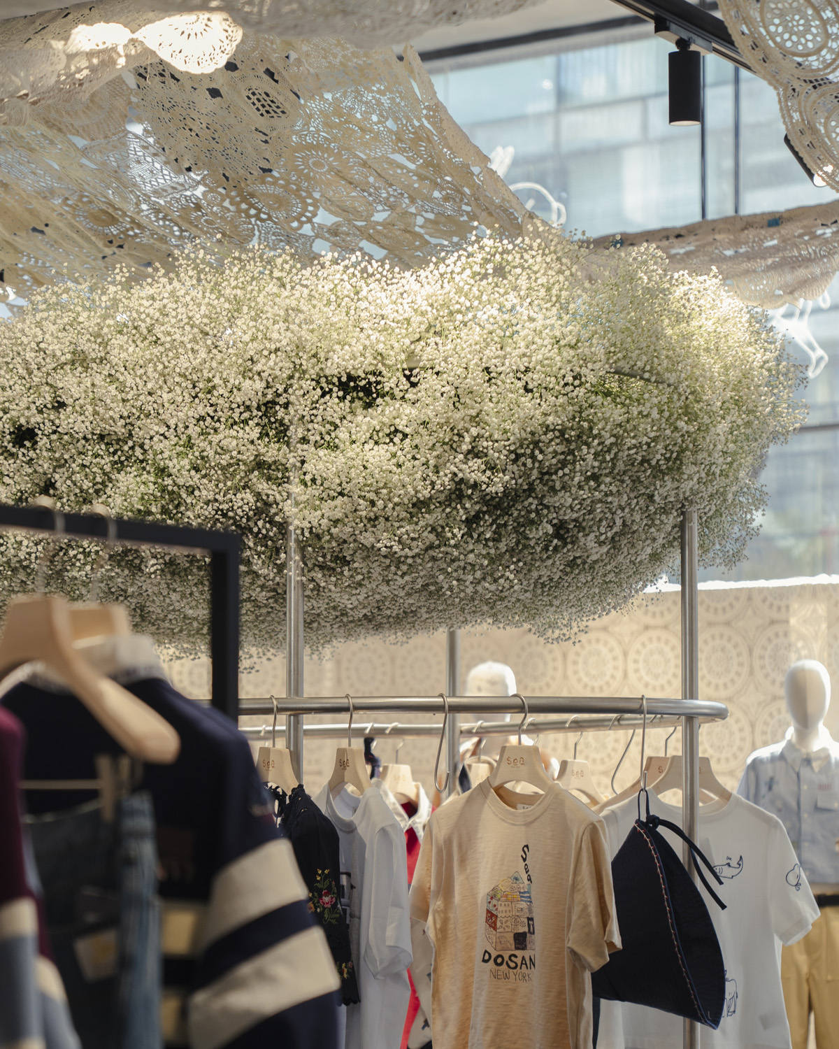 Working With Friend designed and installed the spatial environment for the Sea New York pop-up store at Tom Greyhound Dosan in Seoul. The project aims to translate Sea’s visual language and poetic sensibility into a spatial experience. At the storefront, a house-shaped façade was constructed as an architectural gesture inspired by the brand’s signature motif, creating a warm and inviting presence. Inside the space, layered lace textiles were installed across the walls and ceiling, forming a soft spatial structure around the garments. These suspended elements create subtle layers of light and shadow, extending Sea’s delicate material language into the environment. At the center of the store, a floral installation composed over more than ten hours forms a suspended canopy above the garments, completing the spatial atmosphere. The Sea New York Dosan pop-up store runs until April 9, 2026.