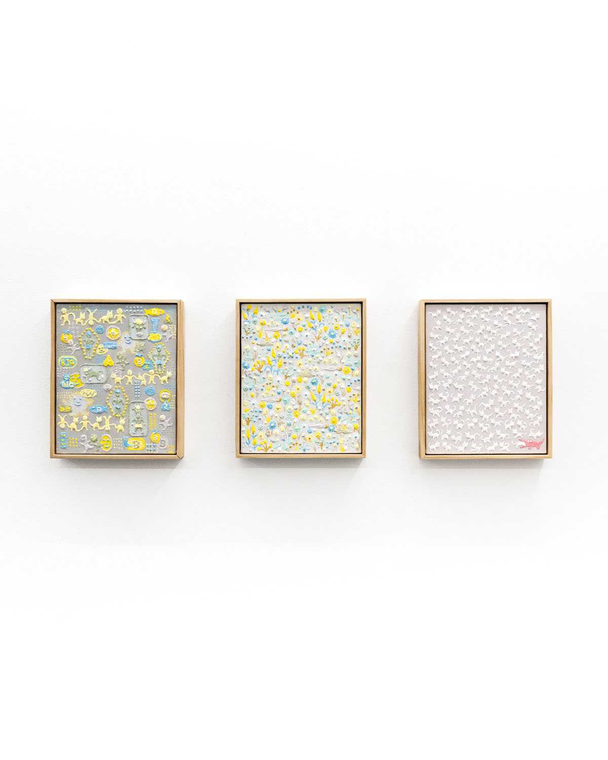 굿모닝타운은 타투로 시작하여 현재는 독창적인 방식으로 다양한 작업을 선보인다. 그의 페인팅은 3차원의 몸을 감싸던 도안에서 2차원의 평면으로 넘어와 캔버스 위에서 툭 튀어나와 있다. 부조 혹은 장난감처럼 보이기도 하는 그의 작업은 시각과 동시에 사람들의 촉각을 자극한다. 작은 캐릭터가 와글와글 모인 그의 페인팅은 이렇게 하나하나 아크릴 물감을 두텁게 올려 완성한 것이다. 이번 전시에서 그는 이러한 방식에서 한걸음 나와 다양한 매체를 통해 더 큰 덩어리의 작업들을 선보인다.